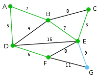 G es el único vértice pendiente, y está más cerca de E que de F, así que se agrega EG al árbol. Todos los vértices están ya marcados, el árbol de expansión mínimo se muestra en verde. En este caso con un peso de 39. | null | null | A, D, F, B, E, C, G |