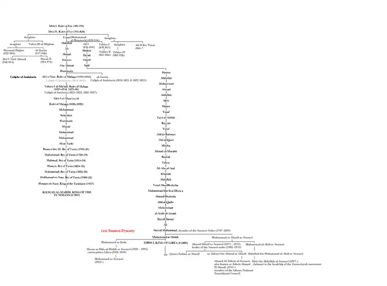 Gráfico genealógico de la ascendencia hasta Mahoma de la dinastía idrisí, gobernantes de Fez y Marruecos, reyes de Túnez y la dinastía Sanusí, fundadores y jefes de la orden libia Sanusí y reyes de Libia también descienden del otro hermano, Hasan ibn Ali, a través de Al-Hassan Addakhil.