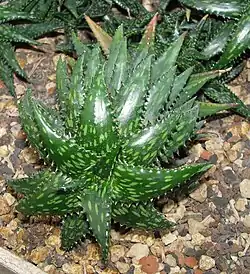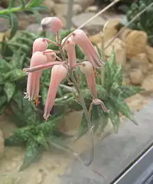 Es una planta suculenta de pequeño tamaño, sin tallo, que forma pequeños grupos. Con unas 12 hojas, triangulares, de 6.4 x 2.5 cm, de color verde oscuro brillante, abundantemente manchadas; con los márgenes armados con dientes triangulares duro. Las inflorescencias son simple, de 35 cm de alto; en forma de racimos cilíndricos, bastante laxos, las brácteas 5 x 3 mm, pedicelos de 6-7 mm de largo. Las flores son de color rosa, colgantes; con perianto de 20 mm de largo.[2][3]