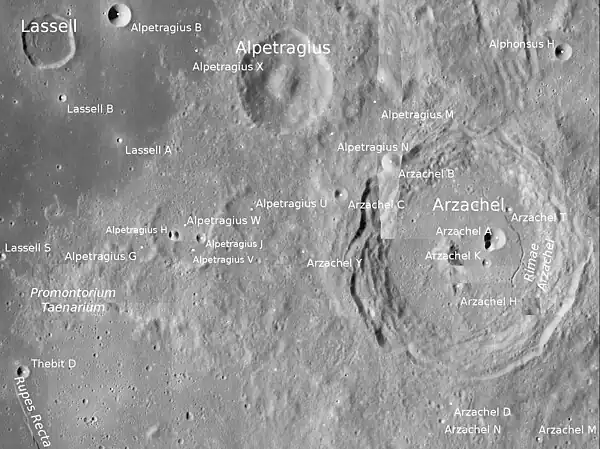 Por convención estos elementos son identificados en los mapas lunares poniendo la letra en el lado del punto medio del cráter que está más cercano a Alpetragius.