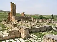 - En el lado opuesto del foro hay un segundo templo (dedicado a un dios o dioses desconocidos), del que solo se conservan el podio y algunos elementos arquitectónicos corintios; a partir de una inscripción parece datarse en 145. En la esquina noreste hay un complejo de edificios que incluye una casa con un peristilo de 16 columnas y mosaicos geométricos en los cuatro pórticos; otros mosaicos se encuentran en el Museo del Bardo. Al sureste de la plaza, un edificio de 10 x 7 metros que probablemente fue una fábrica y una fuente monumental.