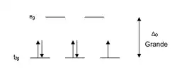 Los ligandos que causan una gran separación Δ en los orbitales atómicos d del metal se suelen referir como ligandos de campo fuerte, tales como por ejemplo el CN− y CO de la serie espectroquímica. En complejos formados por estos ligandos la separación en energía Δ entre el grupo de orbitales de mayor y menor energía resulta mayor que la energía de apareamiento de los electrones, esto causa que los orbitales de menor energía se completen, aún a costa del apareamiento de electrones, antes de comenzar a completar los de mayor energía (ocurre según el principio de Aufbau) este tipo de compuestos son llamados de "bajo espín", porque en ellos la suma de los momentos magnéticos causados por los electrones es la mínima posible. Por ejemplo, el NO2− es un ligando de campo fuerte y produce una gran Δ. El ion octaédrico Fe(NO2)6]3− que posee 5 electrones d, muestra un diagrama de campo octaédrico donde todos los electrones se encuentran en el nivel t2g, este ion es por lo tanto un complejo de espín bajo.