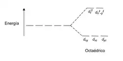En esta disposición octaédrica los orbitales que resultan más gravemente deformados son los que poseen componentes mayoritarias sobre los ejes x, y, z. Observando el gráfico de orbitales d se puede notar que estos orbitales son el dz2 y el dx2-y2, mientras que los orbitales dxy, dxz y dyz reciben una interferencia mucho menor, esto causa que los orbitales d originalmente degenerados se separen en dos grupos con una diferencia de energía que se suele llamar Δoct. Aquí los dz2 y dx2-y2 forman el grupo de mayor energía eg y los dxy, dxz y dyz forman el grupo de menor energía t2g