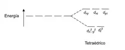 Los compuestos tetraédricos son los segundos más comunes; en estos se considera que cuatro ligandos se acercan al ion metálico central desde los vértices de un tetraedro. Bajo un campo repulsivo tetraédrico los orbitales d se separan nuevamente en dos grupos con una diferencia de energía que se suele llamar Δtet, sin embargo al disponer estos cuatro ligandos lo más alejados uno del otro que resulte posible (no olvidar que los ligandos se repelen también entre sí), se nota que quedan en posiciones "entre" los ejes x, y, z. Por lo que las mayores repulsiones las recibirán los orbitales que posean componentes mayoritarias "entre" los ejes. Al observar el gráfico se puede ver que esos orbitales son los dxy, dxz y dyz formando el grupo de mayor energía, mientras que dz2 y dx2-y2 forman el grupo de menor energía, por lo que la situación resulta a la inversa que en un campo octaédrico. Además debido a que los electrones de los ligandos en el complejo tetraédrico no se encuentran directamente orientados hacia los orbitales d del ion metálico central, la separación entre orbitales de alta y baja energía resulta menor que en el caso de los octaédricos.