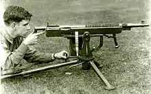 ![]() Una Colt-Browning M1895 de 7 mm, montada sobre su trípode. | ||