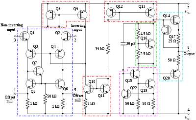 El bloque delineado con azul es un amplificador diferencial. Q1 y Q2 son seguidores de emisor de entrada y junto con el par en base común Q3 y Q4 forman la etapa diferencial de entrada. Además, Q3 y Q4 actúan como desplazadores de nivel y proporcionan ganancia de tensión para controlar el amplificador clase A. También ayudan a mejorar la máxima tensión inversa de los transistores de entrada (la tensión de ruptura de las junturas base-emisor de los transistores NPN Q1 y Q2 es de 7 V aproximadamente, mientras que los transistores PNP Q3 y Q4 tienen rupturas del orden de 50 V).