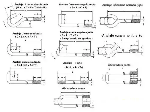 En general los anclajes o tornillos se fabrican con una barra de sección generalmente redonda con rosca en uno o los dos extremos, dependiendo si este es recto o con un extremo curvado, con forma de L, J o U (abrazadera o alcayata), se utiliza comúnmente en muros, pisos de hormigón u otros elementos constructivos, para la fijación, o sujeción de maquinarias o estructuras (desde estanterías, hasta torres de altura, galpones, montaje de motores, generadores o bombas, entre muchos otros).
