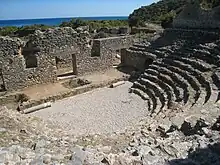 Los restos descubiertos incluyen un gran teatro, un pequeño odeón cubierto o buleuterio, tres baños públicos grandes y uno pequeño, decorados con pisos de mosaico (algunos convertidos para uso industrial en la antigüedad tardía), cuatro iglesias paleocristianas (algunas con pisos de mosaico, en su mayoría inscripciones geométricas y de donantes),[8] y una exedra posiblemente de una basílica civil (tribunal de justicia).[1][4]