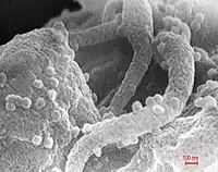 Pequeñas partículas esféricas del virus VIH-1 (70-90 nm), tras su eclosión de un linfocito infectado