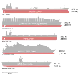 - Knock Nevis: 458,46 metros de longitud y con un peso de 657.019 toneladas totalmente cargado, fue el buque más largo del mundo, acabó desguazado en el año 2010.[1] Era incapaz de navegar por, el Canal de Suez o el Canal de Panamá.[2] Actualmente en servicio hay 4 petroleros de la clase TI que miden 380 metros y desplazan 234.006 toneladas cada uno.[3]