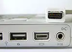 ![]() Male Mini-DVI plug on top of a 12-inch PowerBook G4; female port is second from left. |