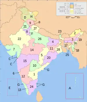 ![]() Estados y territorios de la India, numerados según la tabla | ||||||||||||||||||||||||||||||||||||||||||||||||||||||||||||||||||||||||||||||||||||||||||||||||||||||||||||||||||||||||||||||||||||||