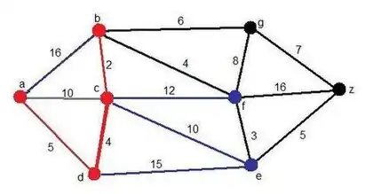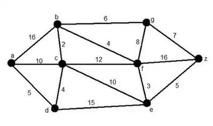 El siguiente ejemplo se mostrara como se desarrollará con el fin de encontrar el camino más corto desde a hasta z: