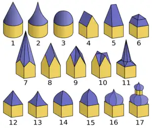 | Tejado cónico | Chapitel | Cúpula bulbosa | Casco renano |