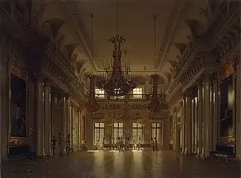 Salón de los Mariscales de Campo rusos en el Palacio de Invierno. Pueden verse coraceros rusos observando las pinturas.
