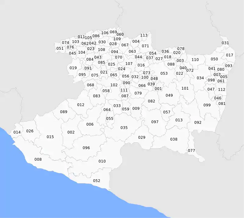 A principios de la década de 1970, el Instituto Nacional de Estadística y Geografía (INEGI) creó una clave de tres dígitos para denominar por orden alfabético a cada entidad federativa y municipio mexicano, con el fin de estandarizar los datos y facilitar los análisis estadísticos. Sin embargo, desde su elaboración, la lista no ha sufrido ninguna modificación, lo que explica que el orden alfabético esté alterado.[1][nota 1] La clave INEGI proporcionada en la tabla también sirve para localizar el municipio en el mapa de abajo.