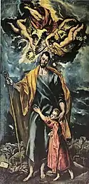 • Periodo toledano tardío: A partir de 1596, y sobre todo a partir de 1605, el Greco entró en una fase de "exaltación y exacerbamiento", con un estilo muy dramático, propio y original, acentuando los elementos irreales: cabezas pequeñas sobre cuerpos alargados, con una luz iluminación intensa que maximiza el colorido de los ropajes.[1]