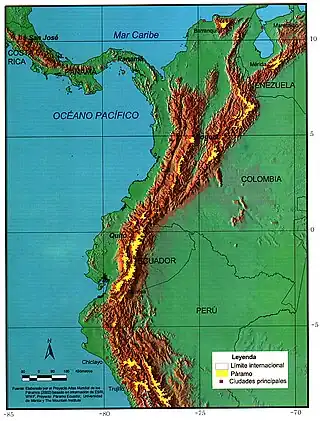 Los páramos colombianos están agrupados en 36 complejos, la mitad de ellos en la Cordillera Oriental, y el resto distribuidos entre la Cordillera Central, la Cordillera Occidental, el Nudo de los Pastos y la Sierra Nevada de Santa Marta:[1]