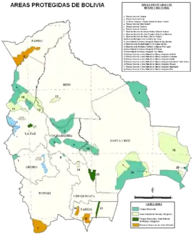 Bolivia cuenta con 22 áreas protegidas nacionales, de las cuales 13 tienen la categorización de parque nacional:[1]