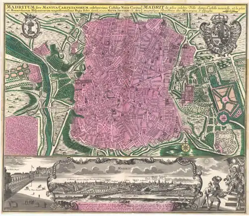 Madritum sive Mantua Carpetanorum celeberrima Castiliae Novae Civitas et Monarcharum Hispanicorum magnificentissima Regia sedes = Madrit la plus celebre Ville dans la Castille nouvelle, et la plus magnifique Residence des Monarques d'Espagne. | 1730[1] | Matthaus Seutter | Este plano está basado en él de Nicholas de Fer de 1706.[2] |
