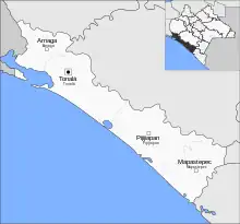 Acacoyagua, Acapetahua, Ayutla, Cacahoatán, Escuintla, Huehuetán, Huixtla, Mapastepec, Mazapa, Metapa, San Benito, Motozintla Tapachula, Tuzantán.