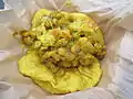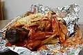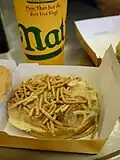 Papas y carne fritas con salsa en una media-baguette. | [31] | |
