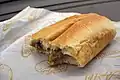 Empanada picante frita con cebolla y salsa picante o salsa de yogur servida entre pan de hamburguesa o perrito caliente | [6] | |