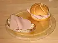 Semejante a Ensaïmada cubierto con azúcar en polvo con jamón y queso. | ||