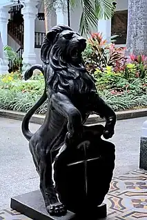 - Escudo: El escudo se otorgó en 1591 formalmente y presenta al león como figura emblemática de Caracas, a partir de la Real Cédula de Felipe II, que la concede a petición del procurador general, en los términos siguientes: "En campo de plata de un león color pardo, puesto en pie, teniendo entre los brazos una venera de oro con la Cruz Roja de Santiago, y por timbre una corona de cinco puntas de oro". A través de una Real Cédula concedida por Carlos III el 13 de marzo de 1766, se oficializa el Escudo de Armas de Caracas, que llevaría una orla con una inscripción en latín sobre la Virgen María como un gesto noble al escudo de la ciudad, con las palabras: Ave María Santísima, sin pecado concebida en el primer instante de su ser natural. La petición original (Ave María Santísima de la luz sin pecado concebida) suscitó una polémica sobre sí debía o no colocarse en la orla del pendón, la cual concluyó con la decisión del Rey, que suprimió la palabra Luz, incorporando "en el primer instante de su ser natural".