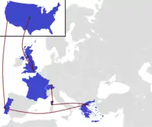 Nueva York, Nueva York (Aeropuerto Internacional John F. Kennedy) o Los Ángeles, California (Aeropuerto Internacional de Los Ángeles) o Charlotte, Carolina del Norte (Aeropuerto Internacional de Charlotte-Douglas) o Chicago, Illinois (Aeropuerto Internacional O'Hare) a Londres,