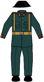 El color característico que actualmente conocemos en su uniforme es el verde, que ya se empezó a imponer durante la monarquía alfonsina y la II República, aunque en tonos más claros, adoptándose un gris-verde más oscuro a partir de la reforma de uniformidad realizada en el año 1940 (Reglamento de uniformidad adoptado a partir de la fusión con el cuerpo de Carabineros) y posteriormente en enero de 1943 (Reglamento de uniformidad y equipo para el Ejército).