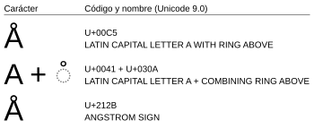 El signo «ángstrom» se normaliza en U+00C5 Å LATIN CAPITAL LETTER A WITH RING ABOVE (entidad HTML Å, Å, o Å).[28] El consorcio Unicode recomienda utilizar este último.[27]