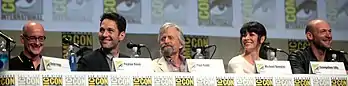Además, John Slattery y Hayley Atwell repiten sus papeles como Howard Stark y Peggy Carter, respectivamente, de previos medios del UCM.[50][51] Slattery afirmó que su participación en Ant-Man "no mucho más" que en Iron Man 2,[52] mientras que Atwell describió su aparición como "más un cameo".[51] Abby Ryder Fortson interpreta a Cassie, la hija de Lang y Maggie;[15][21][53] Gregg Turkington aparece como Dale, el gerente de una tienda de Baskin Robbins;[37][54][55] y Martin Donovan interpreta a Mitchell Carson, un exmiembro de S.H.I.E.L.D. que trabaja para Hydra y busca comprar la tecnología de Yellowjacket.[56][57] La YouTuber Anna Akana interpreta a una escritora en la historia de Luis al final de la película.[58] Garrett Morris, que interpretó a Ant-Man en un sketch de Saturday Night Live, aparece como un conductor de taxi.[59] El cocreador de Ant-Man Stan Lee tiene un cameo como un barman.[60][61] Chris Evans y Sebastian Stan tienen apariciones no acreditadas durante la escena poscréditos como Steve Rogers / Capitán América y Bucky Barnes / Soldado del Invierno, respectivamente.[62] Hayley Lovitt tiene un cameo sin diálogo como Janet van Dyne / Avispa.[63] Lovitt fue elegida por sus "ojos como platillos, como Michelle Pfeiffer", ya que Pfeiffer era la elección soñada de Reed para la Avispa; Pfeiffer luego interpretaría al personaje en la secuela Ant-Man and the Wasp.[64] Tom Kenny proporciona la voz de un conejo de juguete que Scott le da a Cassie.[65]