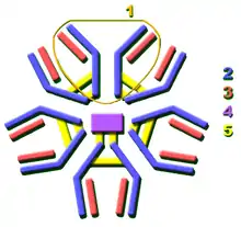 Los anticuerpos son proteínas plasmáticas globulares pesadas (~150 kDa), también conocidas como inmunoglobulinas. Tienen cadenas de azúcares unidas a alguno de sus residuos aminoácido.[31] En otras palabras, los anticuerpos son glucoproteínas. La unidad básica funcional de cada anticuerpo es el monómero de inmunoglobulina, que contiene una sola unidad de Ig. Los anticuerpos secretados también pueden ser diméricos con dos unidades Ig, como en el caso de las IgA, tetraméricos con cuatro unidades Ig como en el caso de las IgM de teleósteo, o pentaméricos con cinco unidades de IgM, como en el caso de las IgM de mamíferos.[32]