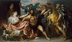 No presentes de manera constante como las pinturas religiosas o los retratos, las representaciones mitológicas e históricas acompañan toda la producción de Van Dyck. Durante el período de colaboración con Rubens, a Van Dyck se le confió un ciclo de pinturas que narrasen y exaltasen la vida y las empresas del romano Decio Mus. Entre sus pinturas más célebres está La continencia de Escipión y Sansón y Dalila. Tras volver de Italia y haber visto numerosas obras de Tiziano, la ejecución de estos temas adquirió una nueva y distinta componente debido a la influencia del maestro italiano. La pintura más famosa de carácter mitológico es sin duda Amor y Psique realizado para el rey Carlos I y ahora propiedad de la reina Isabel II de Inglaterra (Royal Collection).