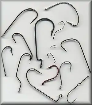 Las partes de un anzuelo son: la punta es la que penetra en la boca del pez; el ojo es el final del gancho que está conectado a la línea de pesca o el hilo; la curva y el cuello en la parte del gancho que une el punto y el ojo; y se denomina brecha a la distancia entre la cuello y el punto. En muchos casos, los ganchos se describen mediante el uso de estas diferentes partes del anzuelo.,[3][4]