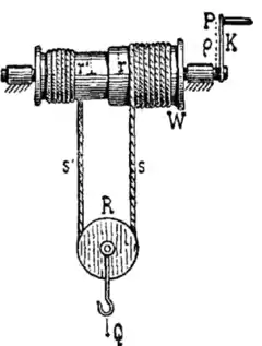 El aparejo diferencial se compone de dos poleas de distinto radio caladas sobre el mismo eje.[1]