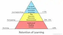 El aprendizaje experiencial es el proceso de aprender a través de experiencia, y se define más específicamente como "aprender a través de la reflexión sobre el hacer".[1] El aprendizaje práctico es una forma de aprendizaje experimental, pero no implica necesariamente que los estudiantes reflexionen sobre su producto.[2][3][4] El aprendizaje experiencial es distinto del aprendizaje memorístico o didáctico, en el que el alumno desempeña un papel comparativamente pasivo.[5] Está relacionado, pero no con otras formas de aprendizaje activo como el aprendizaje activo, aprendizaje aventurero, aprendizaje de libre elección, aprendizaje cooperativo, el aprendizaje en servicio y el aprendizaje situado.[6]