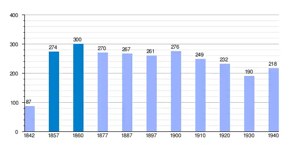 | Gráfica de evolución demográfica de Araguás del Solano[5] entre 1842 y 1940 |