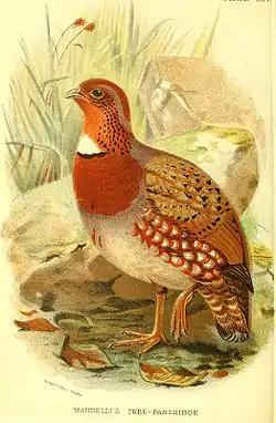 La arborófila pechirroja (Arborophila mandellii) es una especie de ave de la familia de los faisánidos que habita el piso inferior de la selva húmeda, en los alrededores del Himalaya, el norte de la India y sureste del Tíbet.