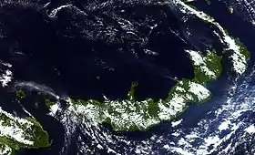 ![]() Vista de satélite de las islas de Nueva Bretaña y Nueva Irlanda, las dos mayores del archipiélago Bismarck | ||||||||||