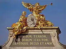 Coronando el arco encima de la acrotera, se disponen las estatuas doradas de Minerva, Pax (la diosa romana que personifica la paz) y Feme (la diosa romana que personifica la gloria), sosteniendo un medallón con el perfil de Luis XV.[9] La figura de Feme sostiene una trompeta en su mano izquierda y una corona de laurel en su mano derecha. Todas estas estatuas son obra de Barthélemy Guibal.