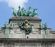 El ático, adornado con guirnaldas de laurel en relieve y exhibiendo un friso decorado con el monograma de Leopoldo II, se eleva sobre el entablamento.[5] En medio se encuentra una plataforma elevada que soporta la cuadriga, y en cuya cara noroccidental (la que da al centro de la ciudad) hay una cartela portando el escudo de armas de Bélgica, rodeado de dos figuras aladas de Victoria, la deidad romana que personifica el triunfo. Una inscripción en la otra cara del pedestal, hacia la avenida de Tervueren, reza en francés «Este monumento fue erigido en MDCCCCV para la glorificación de la Independencia de Bélgica» (indicando el año 1905 en números romanos).