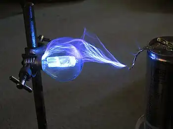 La descarga está producida por electrones que van desde el electrodo negativo al positivo, pero también, en parte, por iones positivos que se mueven en sentido opuesto. El choque de los iones genera un calor intenso en los electrodos, calentándose más el electrodo positivo debido a que los electrones que golpean contra él tienen mayor energía total.