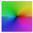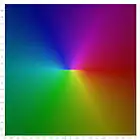 Una superficie de Riemann para el argumento de la relación tan z = x. La superficie naranja de en medio es la función principal, que representa arctan x. La superficie azul de arriba y la verde de abajo están desplazadas verticalmente 2π y 2π respectivamente