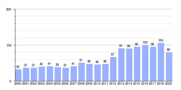 | Gráfica de evolución demográfica de Arentía entre 2000 y 2022 |