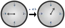 Un uso familiar de la aritmética modular es en el reloj de 12 horas, en el que el día se divide en dos períodos de 12 horas. Si la hora es a las 7:00, entonces 8 horas más tarde serán las 3:00. La adición simple daría como resultado 7 + 8 = 15, pero a las 15:00 se lee como 3:00 en la esfera del reloj porque los relojes "se envuelven" cada 12 horas y el número de hora comienza de nuevo en cero cuando llega a las 12. Decimos que 15 es congruente con 3 módulo 12, escrito , de modo que . Del mismo modo, las 8:00 representa un período de 8 horas, y el doble de esto daría 16:00, que se lee como 4:00 en la esfera del reloj, escrito como .