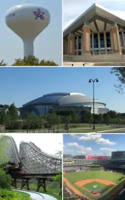 Arlington es la sede del equipo de béisbol Texas Rangers y es la nueva sede de los Dallas Cowboys tras la construcción del AT&T Stadium, concluido en 2009. Además, la ciudad cuenta con varios centros de entretenimiento como "Six Flags Over Texas. Además en el año 2016, se celebró el evento de wrestling de la promoción WWE, Wrestlemania 32.
