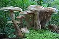 Cuando los cuerpos frutales son jóvenes, la parte inferior de las tapas tiene una capa algodonosa de tejido que se extiende desde el borde de la tapa hasta el tallo, un velo parcial, que sirve para proteger las branquias en desarrollo. A medida que el tapón aumenta de tamaño, la membrana finalmente se separa de la tapa para exponer las branquias. Las branquias tienen una unión adnata (unida de forma cuadrada) a algo decurrente (que se extiende por la longitud del tallo) hacia el tallo. Inicialmente son blancos, pero envejecen a una naranja cremosa o pálida cubierta con manchas de color óxido. El tallo mide 4-10 cm (1.6-3.9 pulg) de largo y 0.6-1.8 cm (0.24-0.71 pulg) de grosor, y casi en forma de maza con una base de hasta 1.3-2.7 cm (0.5-1.1 pulg) de grosor. Por encima del nivel del anillo , el tallo es de color naranja pálido a marrón, mientras que debajo es de color blanquecino o rosa pálido, y se vuelve marrón grisáceo en la base. El anillo se coloca alrededor de 0.4-0.9 cm (0.16-0.35 in) por debajo del nivel de la tapa, y puede estar cubierto de micelio algodonoso de color amarillento a pardo pálido. La base del tallo está unida a los rizomorfos , estructuras en forma de raíz negras de 1-3 mm de diámetro. Si bien la función principal de los micelios subterráneos es absorber los nutrientes del suelo, los rizomorfos cumplen una función más exploratoria, para localizar nuevas bases de alimentos.[23][24]