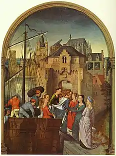 Aparece Santa Úrsula junto a sus compañeras llegando a Colonia, de camino a Roma. Úrsula, vistiendo atuendo de princesa con el pelo trenzado y joyas, se dispone a pisar tierra asistida de sus vírgenes. Una de ellas sostiene la cola del vestido mientras que la otra apoya el brazo de Úrsula para ayudarla. Al fondo de la escena, aparecen compañeras entrando a la ciudad, en dirección a la catedral y las torres de Colonia.